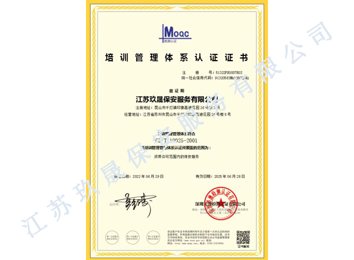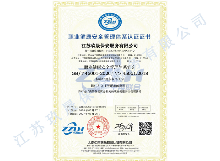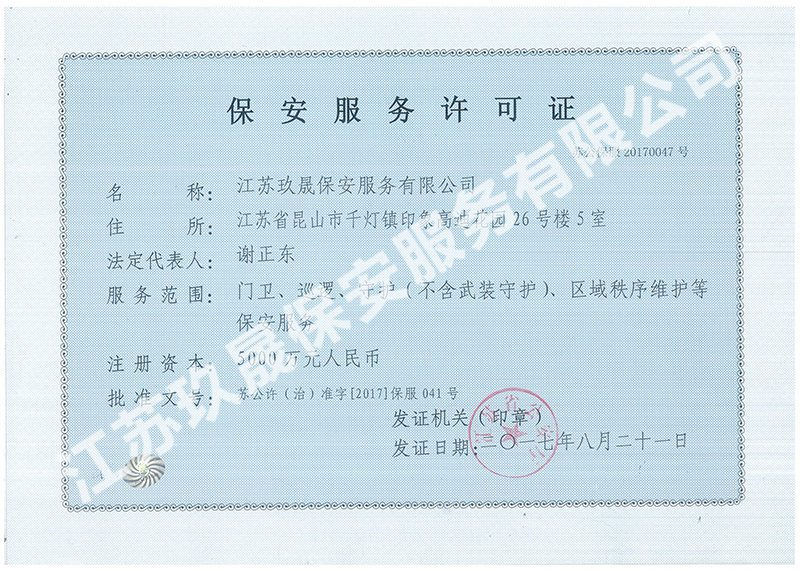 江蘇玖晟保安服務有限公司成立于江蘇省昆山市千燈鎮。注冊資金:2000萬,是擁有省公安廳頒發(fā)的保安服務許可證的企業【蘇公保服20170046】,也是昆山市保安協會常務理事單位。